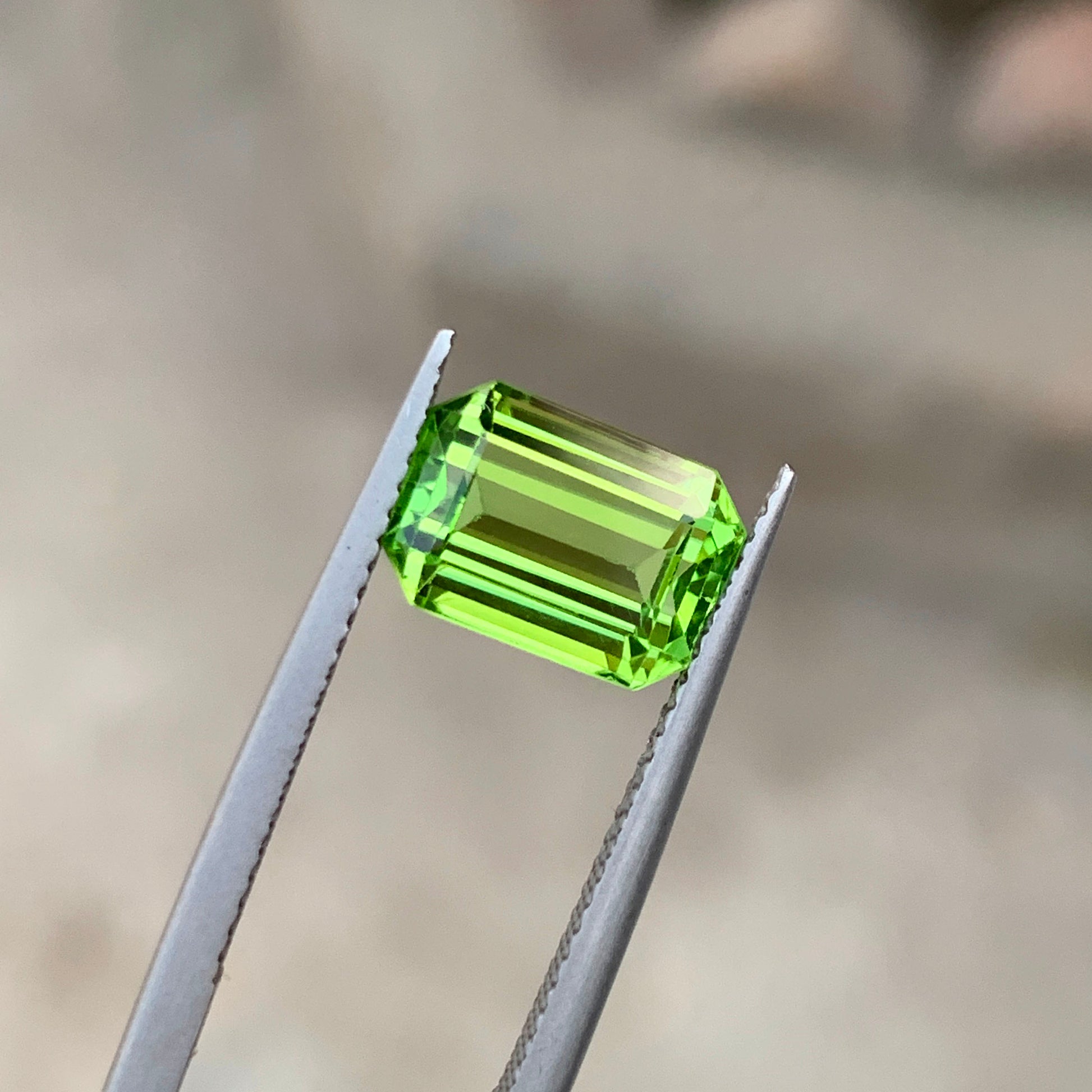 Weight : 3.60 CT Dimensions : 10.5 x 7.5 x 5 mm Shape : Emerald Color : Apple Green Clarity : IF Treatment : None Hardness : 6.5-7 Origin : Mansehra, Abbottabad Family : Forsterite