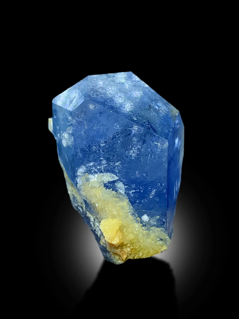 Presenting this remarkable specimen features the deepest-color-saturated double terminated large fatty crystal I have ever seen, and it is perched at the centre of the beautiful matrix ,It has an imposing size to it,and the shape is unusually tabular and equant whereas most of these are pointed and slender in larger sizes.It just seemed unique out of all I had seen -and in person, the shocking color saturation combined sparkle yellow matrix that is hard to convey in video ,makes it incredibly impactful on a shelf.the size and colour is something i never saw myself buying much of in the past, because they were common. However,that is precisely why we should pay attention when they get THIS good ! It has so amazing display in person with really good colour and luster.
