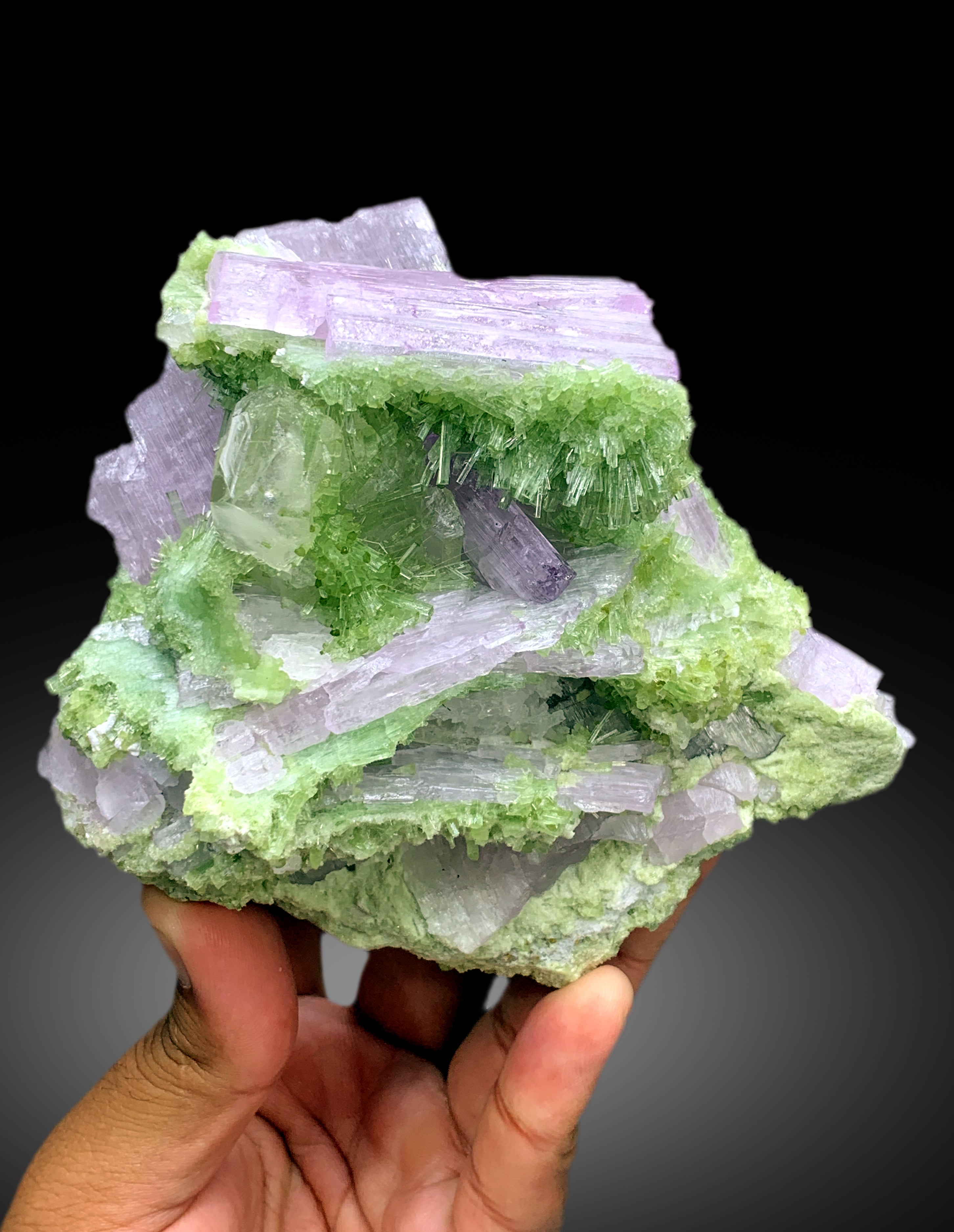 A really impressive combination specimen of floater Kunzites with lovely green Tourmaline crystassl. The combination of color makes a great contrast. Specimen has a huge number of green tourmaine crystals residing on the pink kunzites. Specimen also contains quartz crystal. It also has etched white pollucite crystal. The overall aesthetics are very much appealing.