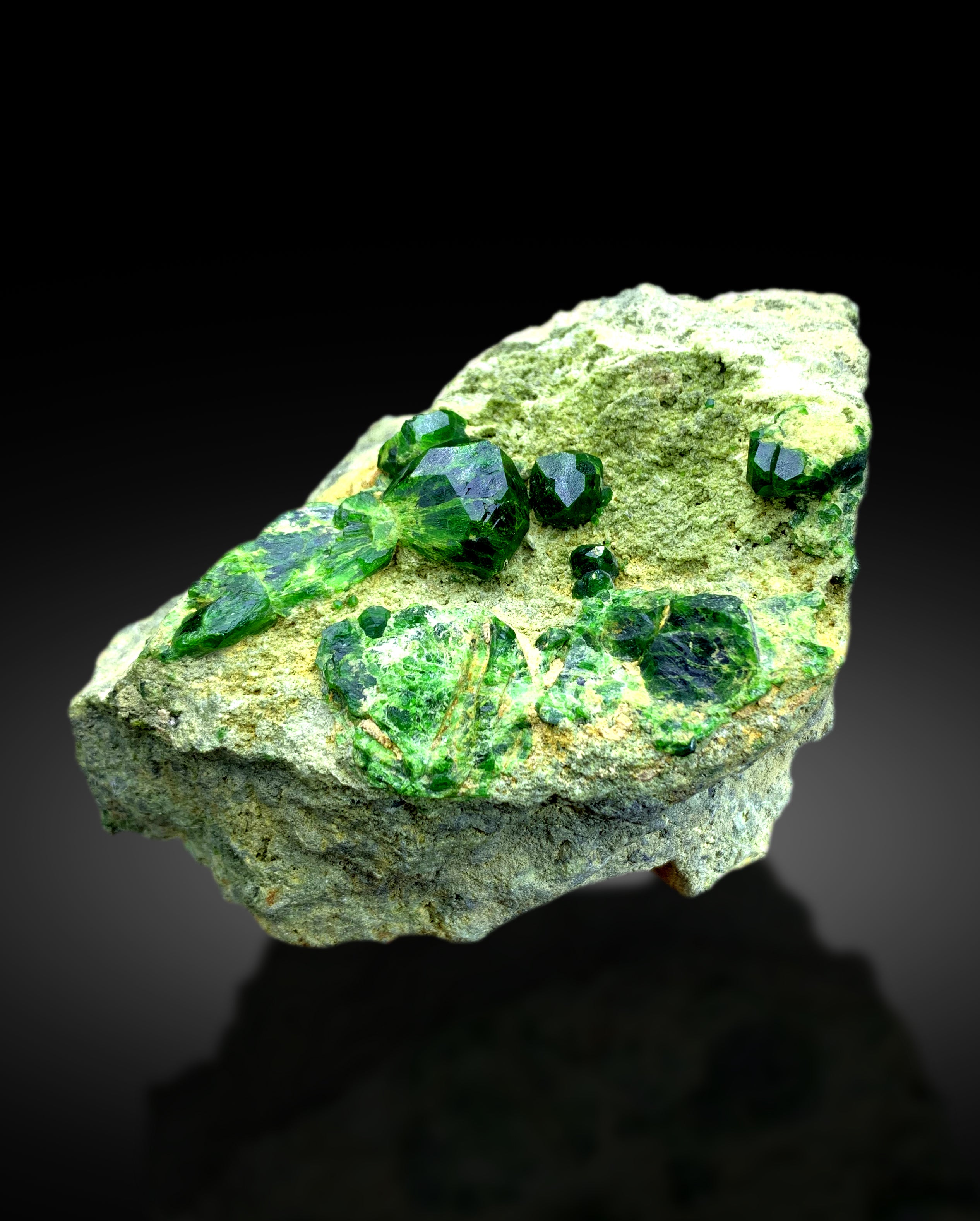 Specimen contains termination and damage free Lush Green Demantoid garnet crystals.